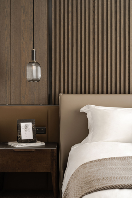 深色調的木材和材質規劃, 讓居者能夠脫離塵囂,回歸自我的內心。