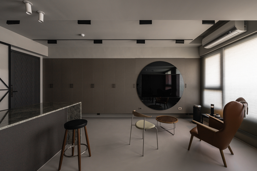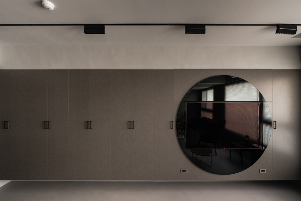 客廳主牆以圓形鏡面與電視形成視覺中心,